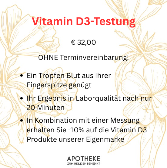 👉🏻Jetzt Vitamin-D3-Testung direkt bei uns in der Apotheke! Schnell, unkompliziert und zuverlässig – für mehr Klarheit und gezielte Beratung.